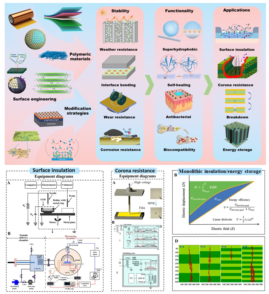 聚合物材料具有优异的绝缘性能、低的介电损耗、质轻、柔性、以及好的可加工性等特质,因而其在高性能电子电气设备中扮演着至关重要的角色。目前,学院贾申利教授的先进电工材料与新型电气设备团队重点关注和研究能源电力行业中的电气设备,包括真空开关/断路器、电容器、变压器、电缆组件、大型发电机等。典型的几种聚合物材料改性策略如单体/分子结构设计,聚集态结构调控,纳米复合强化已经取得了一系列的研究进展。然而,已有研究总是忽略聚合物材料绝缘失效往往是从表面开始,且高频电场将明显加速失效历程。聚合物材料表面改性工程是一种快速、低成本、可扩展的策略,从而在解决上述关键问题上具有独特的优势。因此,本文讨论和分析了表面改性工程引入的特定表面形貌、物理化学结构、电荷传输行为等如何提升聚合物材料的多尺度绝缘性能(从表面到内部以及高频电场应用环境)和介电储能性能。同时,聚合物材料表面改性工程多功能性和稳定性的协同构筑是未来先进电工材料多应用场景和高性能应用的发展趋势。