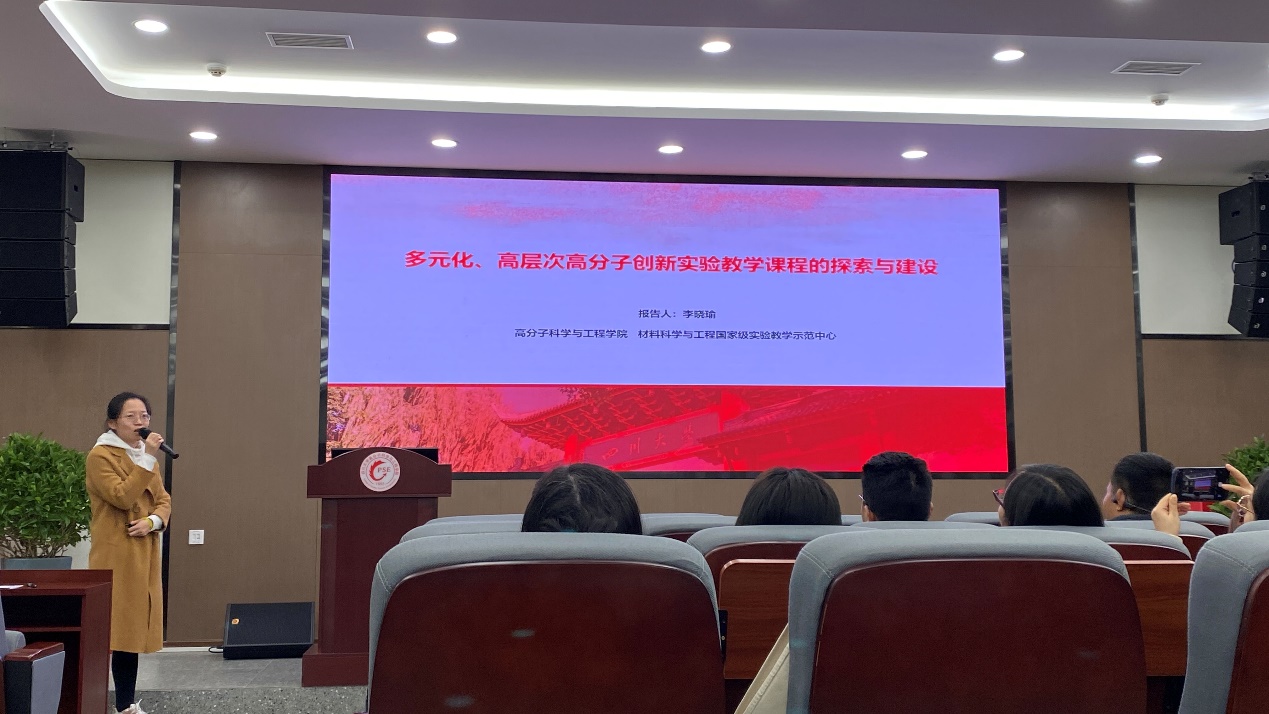 交流会中,示范中心秘书李晓瑜老师以“多元化、高层次高分子创新实验教学课程的探索与建设”为题,向在座老师展示了多元化、高层次高分子创新实验教学课程具体实施流程。