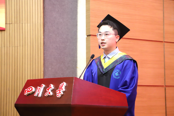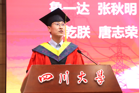 四川省优秀大学毕业生、2025届硕士毕业生黄龙同学代表全体毕业生向学校、学院及老师们致以诚挚的感谢与敬意。他讲述了自己从参与到带团队开展“专业+志愿”的实践活动经历,以及受到“时代楷模”国网成都高新连心桥党员服务队感召实现专业与社会责任融合的感悟。他号召毕业生们秉持担当,在能源电力、智能制造领域贡献川大电气学子的力量。