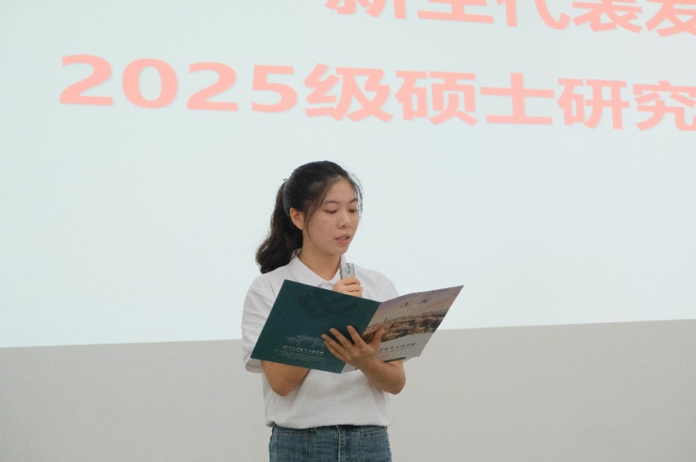 2025级硕士研究生新生钟涵池作为新生代表发言。她认为,研究生阶段的核心命题,是完成从“学习者”到“创造者”的身份蜕变,这不仅意味着学术能力的深化,更是一场向内的自我探寻与向上的生命成长。唯有在实现梦想的征程上秉承“追求卓越,追求一流”的精神,方能在探索之路上,既见学问真谛,亦遇更杰出的自己。