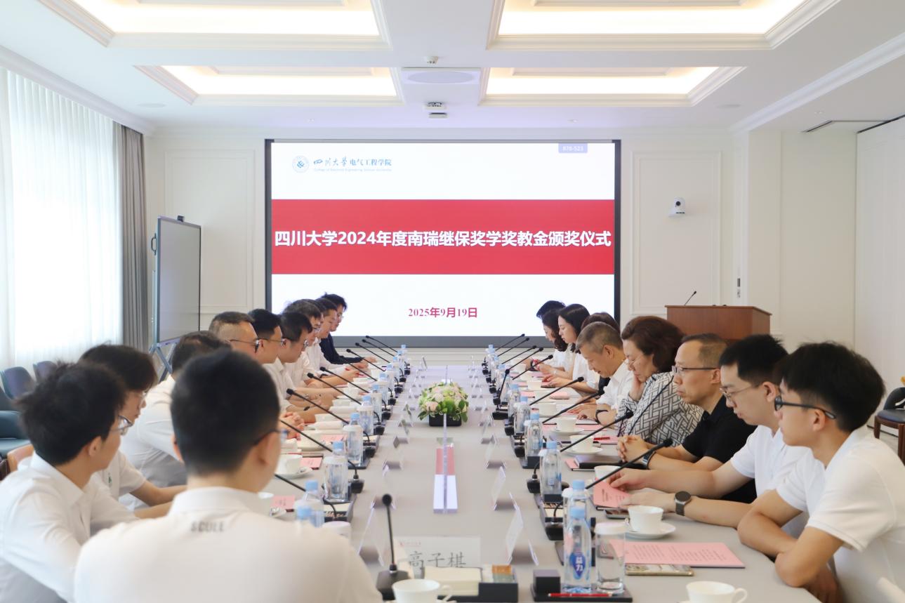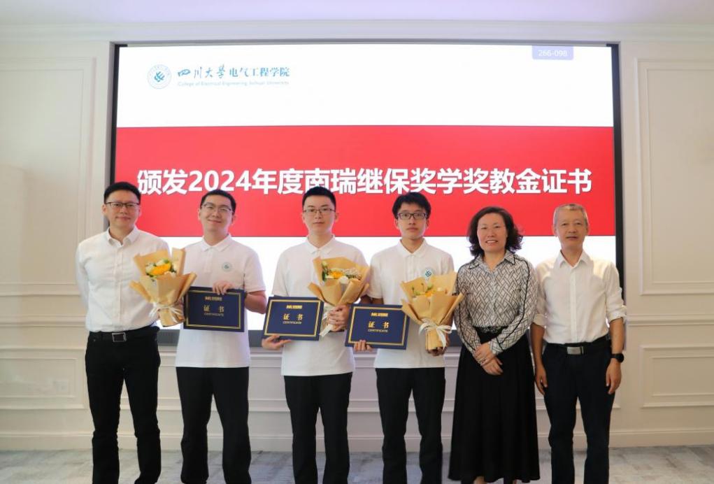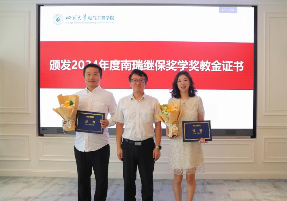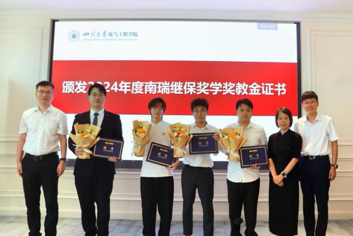 2024年度南瑞继保奖学奖教金颁奖仪式在望江校区举行。南京南瑞继保电气有限公司副总经理兼研究院院长文继峰,工程服务中心主任周敬,人力资源部副主任徐超,营销中心华中大区经理苏涛,研究院柔性所副所长邹强,营销中心四川省区经理陈炜;学校党委学生工作部副部长卢希芬,对外联络办公室副主任贾秀娥;学院党委书记赵昱辉,院长肖先勇,副书记戴婷婷,副院长李长松出席仪式。颁奖仪式由戴婷婷副书记主持。