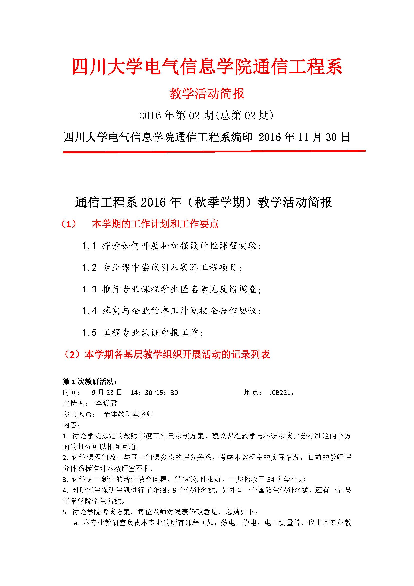 通信工程2016年(秋季学期)教学活动简报