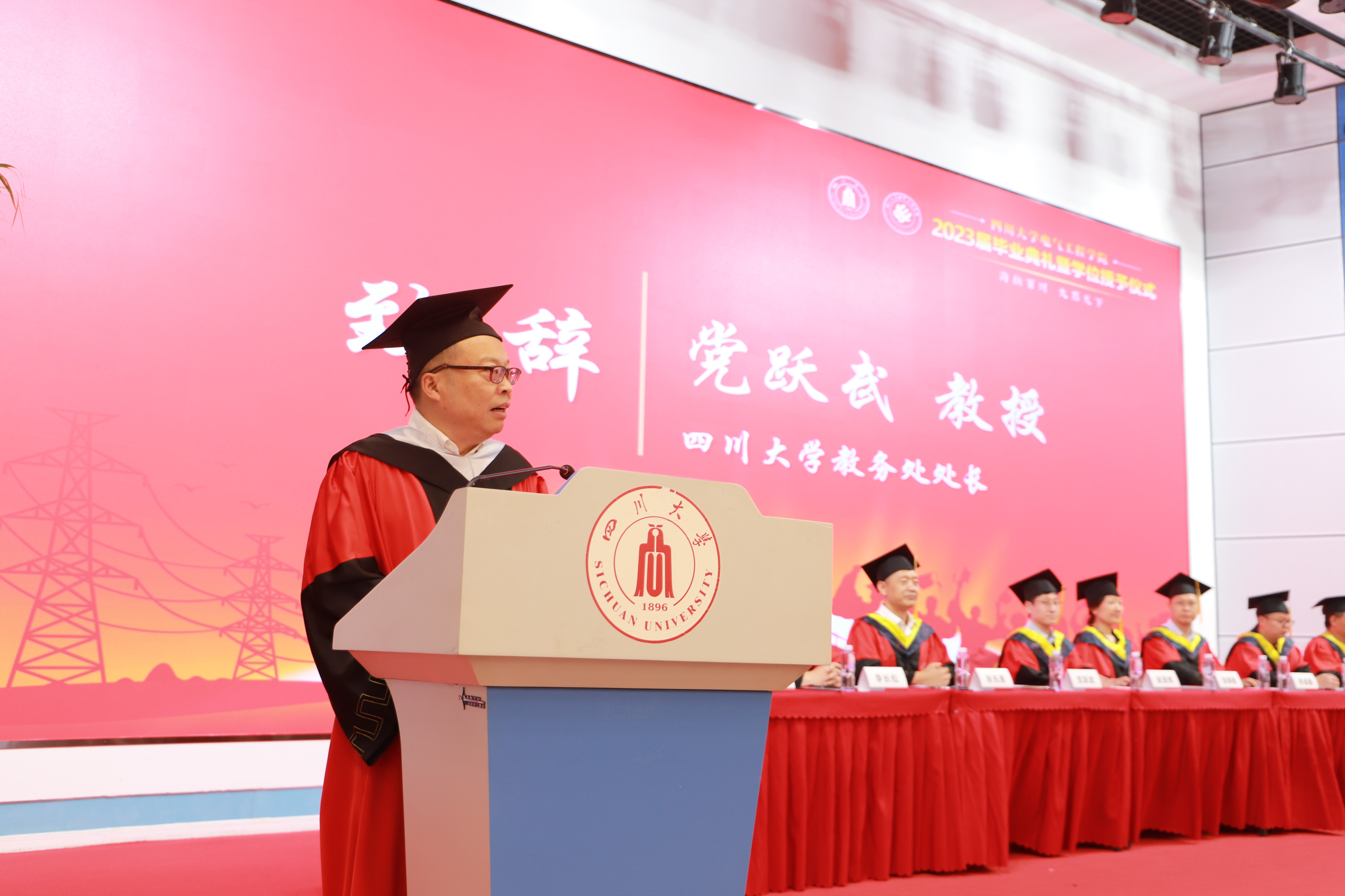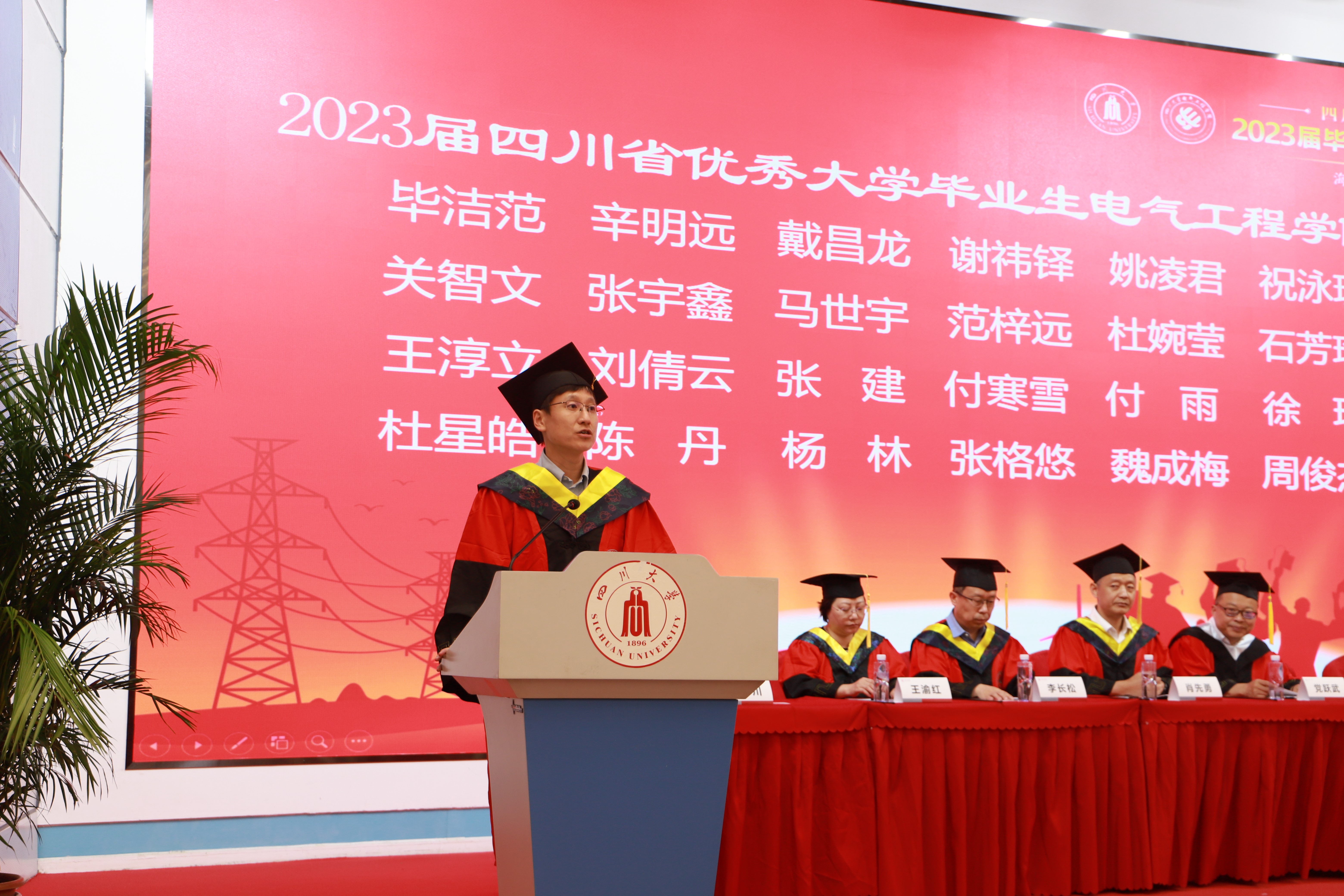 党委书记赵昱辉、院长肖先勇,副书记张英敏、戴婷婷,副院长李长松、李成鑫,电气工程系主任王渝红、博导代表何川,自动化系主任赵涛、博导代表苗强,以及2023届毕业生和学生家长代表参加了毕业典礼。典礼由戴婷婷副书记主持。