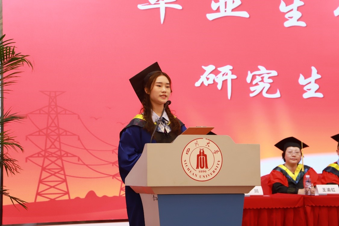 四川省优秀毕业生、国家奖学金、宝钢奖学金获得者硕士研究生魏成梅同学代表毕业生对学校、学院和老师们表达感谢和敬意,号召同学们在未来面对各种困难和挑战时,要保持才智、勇气和毅力,勇于承担青年人的使命和责任,成为下一代推动能源领域创新的中坚力量,祝愿每位毕业生都走在开满鲜花的道路上,取得更加辉煌的成绩。