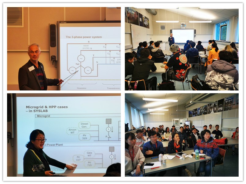 专题讲座由丹麦技术大学电气工程系Chresten Træholt教授和高级研究员宗毅老师讲授与指导。两位老师重点介绍了实验室的建设情况:综合能源实验室是丹麦技术大学在Risø National Laboratory国家实验室基础上搭建的大型可再生能源智能分布控制实验平台,目前主要包括:风力发电机、光伏发电、钒电池、智慧小屋及柴油发电机、备用负荷等部分,通过400V交流总线接入并依托局域网提供监测、监控和通讯功能。