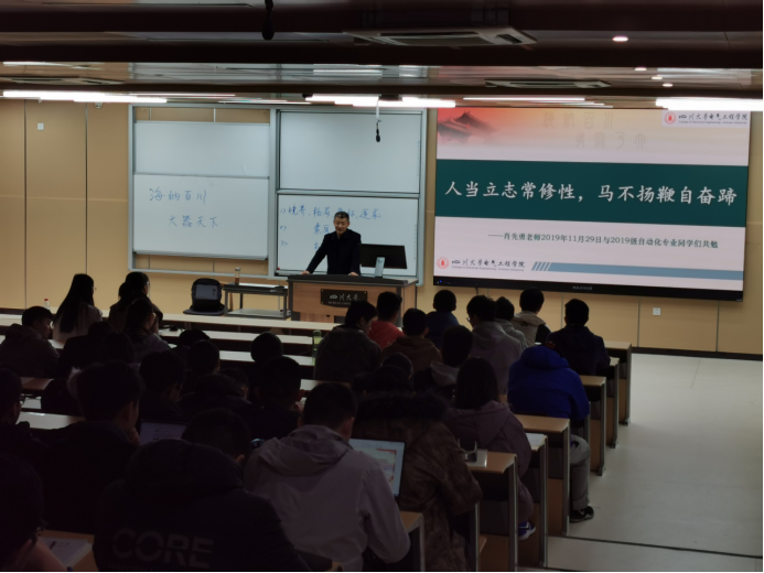 院长肖先勇以“人当立志常修性,马不扬鞭自奋蹄”为主题,在江安校区综合楼C座207为2019级自动化专业本科生开讲专题思政课。