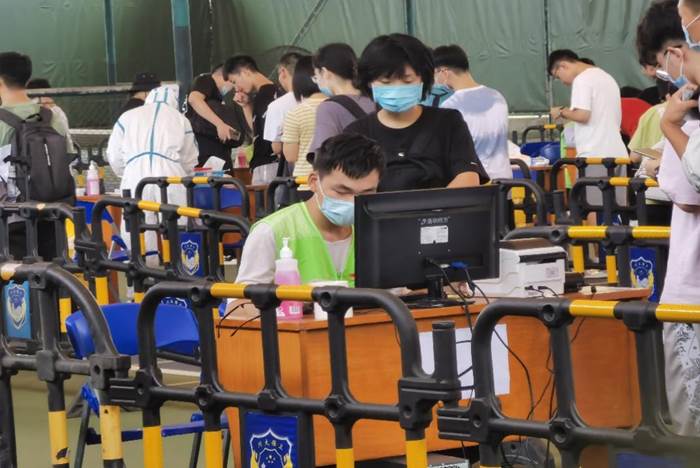 迎新志愿者积极引导新生进行入学核酸检测的工作。服务期间,志愿者们协助维护现场秩序,协助引导应检人员分批、有序地进行检测采样;同时,志愿者们提醒新生戴好口罩、避免交谈、保持适当距离,做好医务人员服务工作,助力核酸检测工作有条不紊地进行。