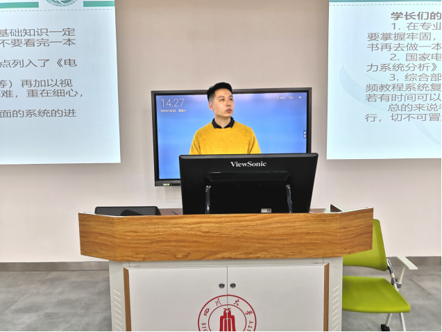 2019年国网统一考试经验交流会在望江校区基础教学楼C座101教室顺利举行。交流会由学院学生科副科长胡劼老师主持,邀请了学院2019届级毕业生刘春法分享考试经验。学院有意愿参加今年国网统一考试的本科生、研究生参与了此次交流会。