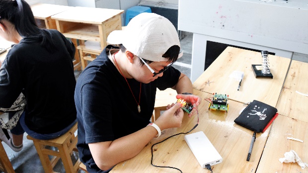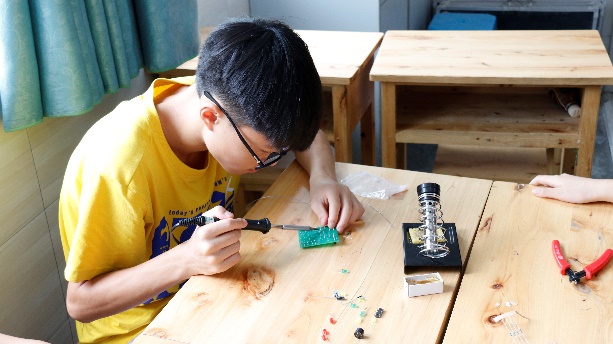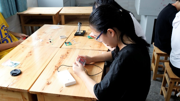 8月9日上午8:30,别开生面的一天在精彩纷呈的实践课程中开始了。二班和三班是电焊课,在电焊之前,主讲队员首先说明了各个元器件的名称、功能及焊接方式。待队员讲解完后,同学们跃跃欲试,开始了方块灯和梦幻彩灯的焊接。焊接过程中,助教始终在旁边为同学们答疑解惑,并对一些操作进行示范和辅助。学生们完成焊接后,队员们会对方块灯和梦幻彩灯进行通电发光检验,发现学生作品中出现发光间断,声音过小等问题时,主讲队员和助教会针对该种情况发生的原因进行解答,并指导学生对作品进行相应的调整。