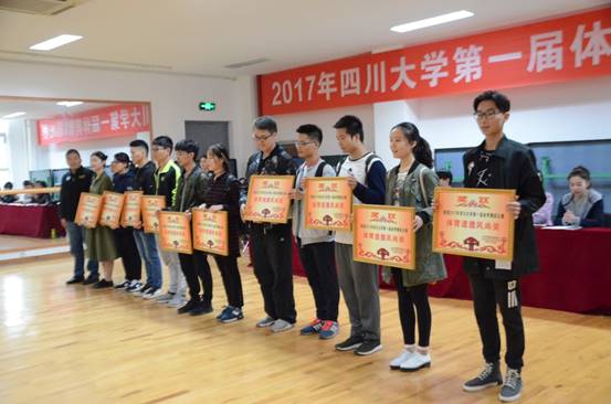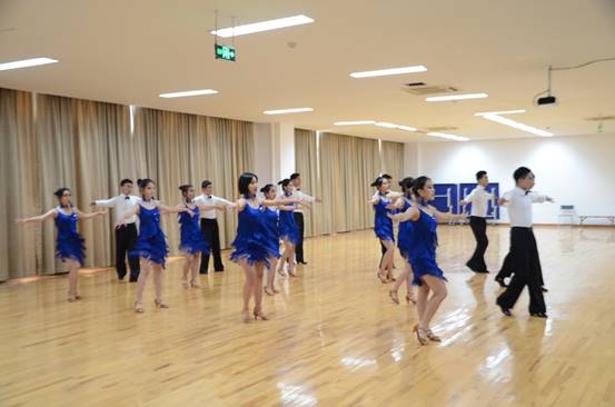 体育舞蹈代表团作为第一支上场队伍开始了他们精彩的表演。一曲《sexyback》点燃全场,参赛队员们忐忑的心情随着动感的音乐渐渐变得轻松而兴奋。蓝色裙摆随着音乐节奏飞旋,一个个摆头与扭动展现着青春的力量,丰富的眼神交流将音乐中无法言语的情感完美表达。女生的舞姿激情而充满魅力,男生的动作潇洒而彰显活力,流动的音符通过舞者自然的肢体动作与步伐表现得淋漓尽致,台下掌声连连。最终,电气信息学院体育舞蹈代表团荣获“精神文明风貌奖”。