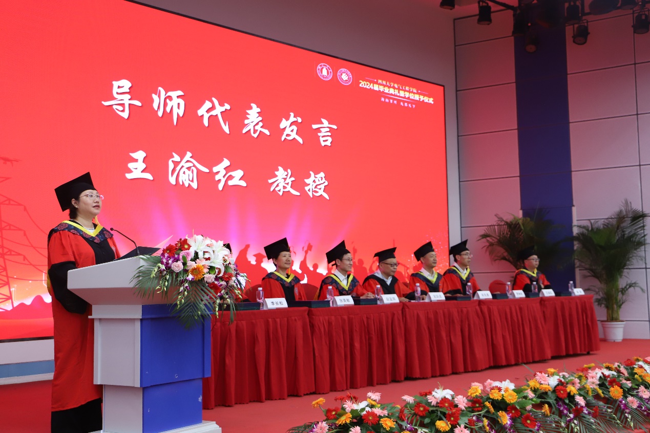 教师代表、电气工程系主任王渝红在发言中对毕业生们顺利完成学业,即将迎来人生中新的重要起点表示祝贺,同时也表达了对毕业生们的祝福与期望。她说,祝同学们心中有爱:爱国家,爱事业,爱自己;愿同学们有为:事业逐步发展,家庭合睦兴旺;愿同学们有趣:抚慰自己的灵魂,享受生命的乐章。