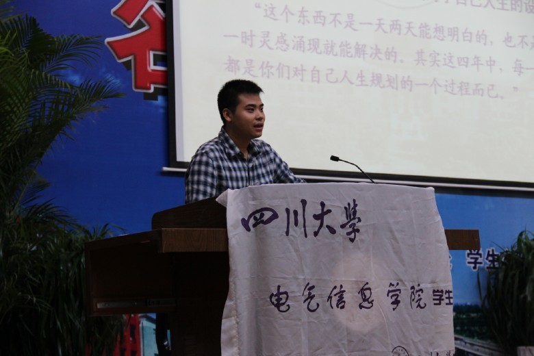 会上,研究生学长黄潇文首先作了讲话。黄潇文学长回顾自己大学本科四年的经历,介绍了职业生涯规划的重要性,同时给新生提出了职业生涯规划的建议。黄潇文学长细致剖析了新生入校容易出现迷茫的现状,指出新生们应该逐渐明确自己的人生方向并为之而努力。接下来,张小迁学长作了精彩发言。张学长详细描述了自己课余生活,分享了自己参与各种活动的感悟,为新生充分展示了一个丰富多彩的大学生活。