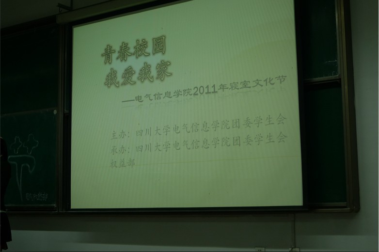 2011年11月23日,电气信息学院寝室文化节评选活动颁奖晚会在江安校区一教B座103举行,同时宣告着为期三天的电气信息学院寝室文化节圆满地落下了帷幕。电气信息学院副主席曾科,历史学院权益部部长陈贝贝,华西基础医学与法医学权益部部长宋桂文,化学学院权益部部长朱宏,电气信息学院权益部部长杨雅迪,组织部部长雷雨,公关礼仪部部长韩贵超担任此次寝室文化节评选活动的评审。