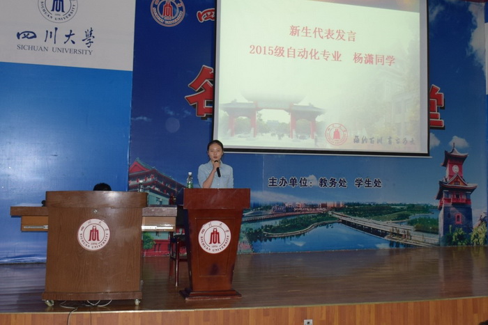 最后,2015级新生代表杨潇同学进行了发言。作为一名新生,她的话语中充满了对大学新生活的期待,洋溢着年轻人的青春与朝气,同时也表达了对自己的严格要求,立志做一名优秀的川大学子。