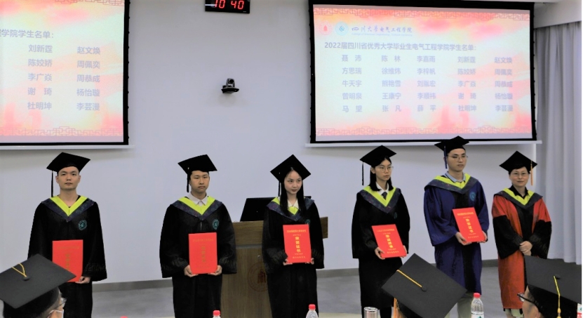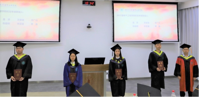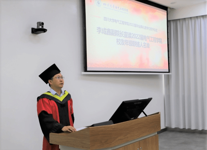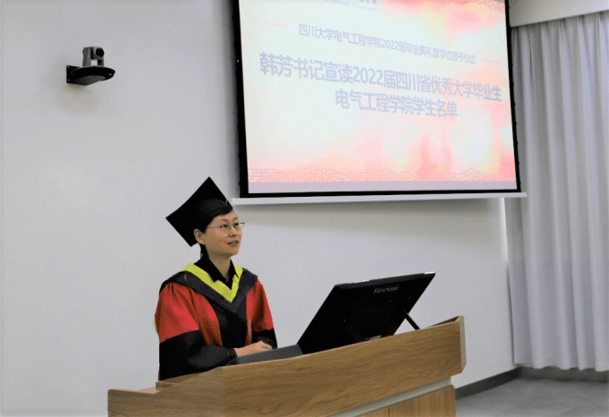 党委书记韩芳、院长肖先勇、党委副书记戴婷婷、副院长周步祥、副院长李成鑫、电气工程系主任王渝红、自动化系主任佃松宜、电工电子基础实验教学中心主任周群、电气工程系党支部副书记刘亚梅以及2022届毕业生代表参加了毕业典礼。典礼由党委副书记戴婷婷主持。