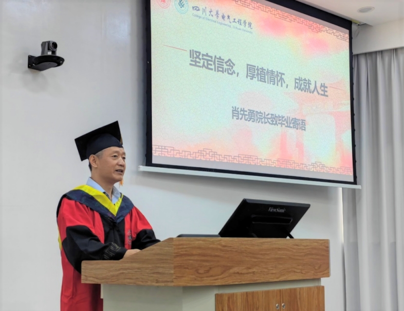 院长肖先勇教授为所有毕业生送上题为《坚定信念,厚植情怀,成就人生》的毕业寄语。肖院长对同学们提出三点希望:一是坚定信念,心中有梦。希望同学们坚定理想信念,始终心中有梦,将个人理想与祖国前途、民族命运紧密联系起来相连,在建设伟大祖国中成就更加优秀的自己。二是守正奉献,眼里有光。肖院长鼓励同学们把所学专业知识和所培养的创新能力,更多用于服务国家需要,服务社会,服务地方经济。三是砥砺奋进,大器天下。肖院长勉励同学们继续保持砥砺奋进,大器天下的底色,永远“做想不优秀都不可能”的川大电气人。希望大家永葆川大气质,永葆川大电气本色,把川大精神、电气气质发扬光大,并通过同学们在未来的人生道路中把川大精神、川大气质用于服务国家、奉献时代。最后,肖院长表示MX动漫