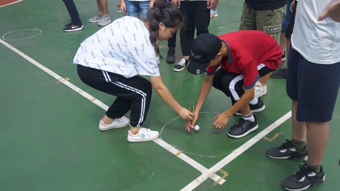 第一个比赛项目是“四人五足”。这要求四个人“心往一处想,劲往一处使”。在“一、二”声的呐喊中,同学们齐心协力,奋力前行。在激烈的角逐之后,二班以微弱的优势夺得冠军。第二个比赛项目游戏是“杯子跑”,这同样是一个合作游戏,同学们用各种不同的方式,在保证杯子中的水尽量不洒的同时,迅速接力跑完全程。最终一班凭借更出色的配合,摘取桂冠。最后的活动是乒乓球接力,全体学生和部分队员参与其中,比赛气氛逐渐推向高潮。参赛的同学们和队员们都全身心地投入到比赛当中,周围的同学们不时的鼓劲呐喊,场外一片欢声笑语。同学们将青春的光芒发挥到极致,将热情染满整个活动现场。