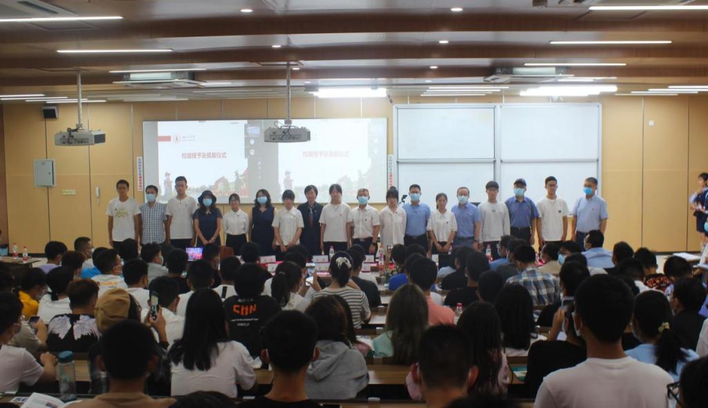 典礼的最后一项议程,是校徽授予仪式。学院领导和教师代表为2021级新生代表现场佩戴校徽。