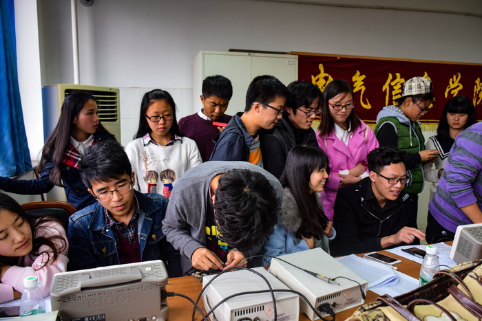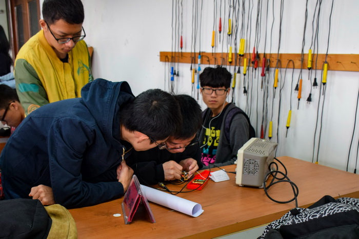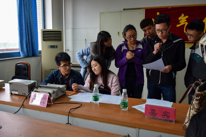 比赛开始前,参赛选手已陆续到场并进行签到,各小组按照签到顺序依次进行了现场调试。各小组在决赛来临前都做好充分的准备,现场气氛紧张而审慎。选手们将各自独立完成连接、调试工作的功率放大器与示波器相连通,认真专注地调试波形和放大倍数。大多数团队的调试结果都相当符合选手们的预期,波形和放大倍数均能达到竞赛要求。即使是一时未能达到理想效果的队伍,也以对自己成果的耐心与对达到目标的信心一遍遍重复着调试工作,这种钻研精神在今后的学习与科研道路上是极其重要的,也是我们工程专业的客观需要。