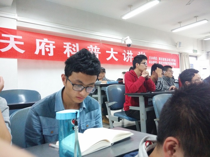 电气信息学院承办的“天府大讲堂”在江安校区第一教学楼D503成功举行。电气信息学院李小根老师主讲,辅导员卜涛老师和近200名电子设计爱好者出席。