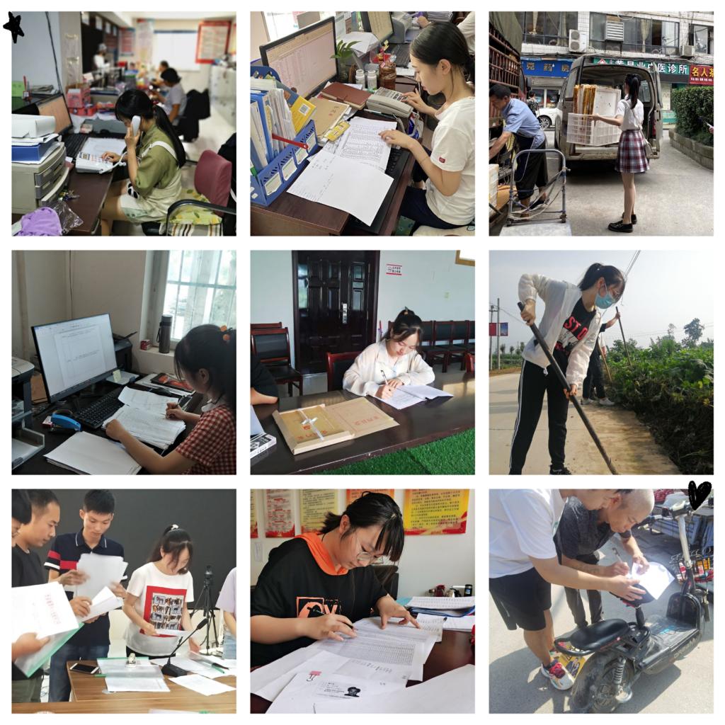 陈姣娇、李文婧等5位同学前往社区报到,帮助社区整治街道、监督社区道路改建、整理资料、帮助社区登记并整理居民信息,听取工作会议报告,作为志愿者进社区清理小广告、宣传防疫知识,帮助社区开展第七次人口普查工作以及贫困居民建档立卡登记工作,跟随单位领导走访居民调查民情等。