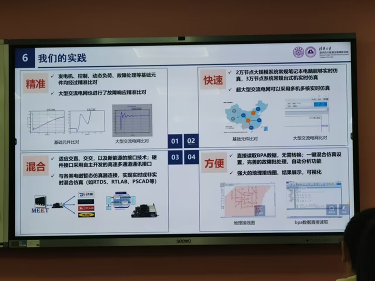 张工向同学们介绍了电力系统仿真的目的、评价仿真好坏的两大标准:准与快、电力系统仿真遭遇的挑战以及他们团队研发的机电电磁混合仿真软件。张工特别指出:“一个既准又快的仿真需要全链条的可靠,对人员的要求很高”,并告诫同学们要对仿真得到结果时刻保持有怀疑态度,盲目坚信自己的仿真结果是工作中的大忌。