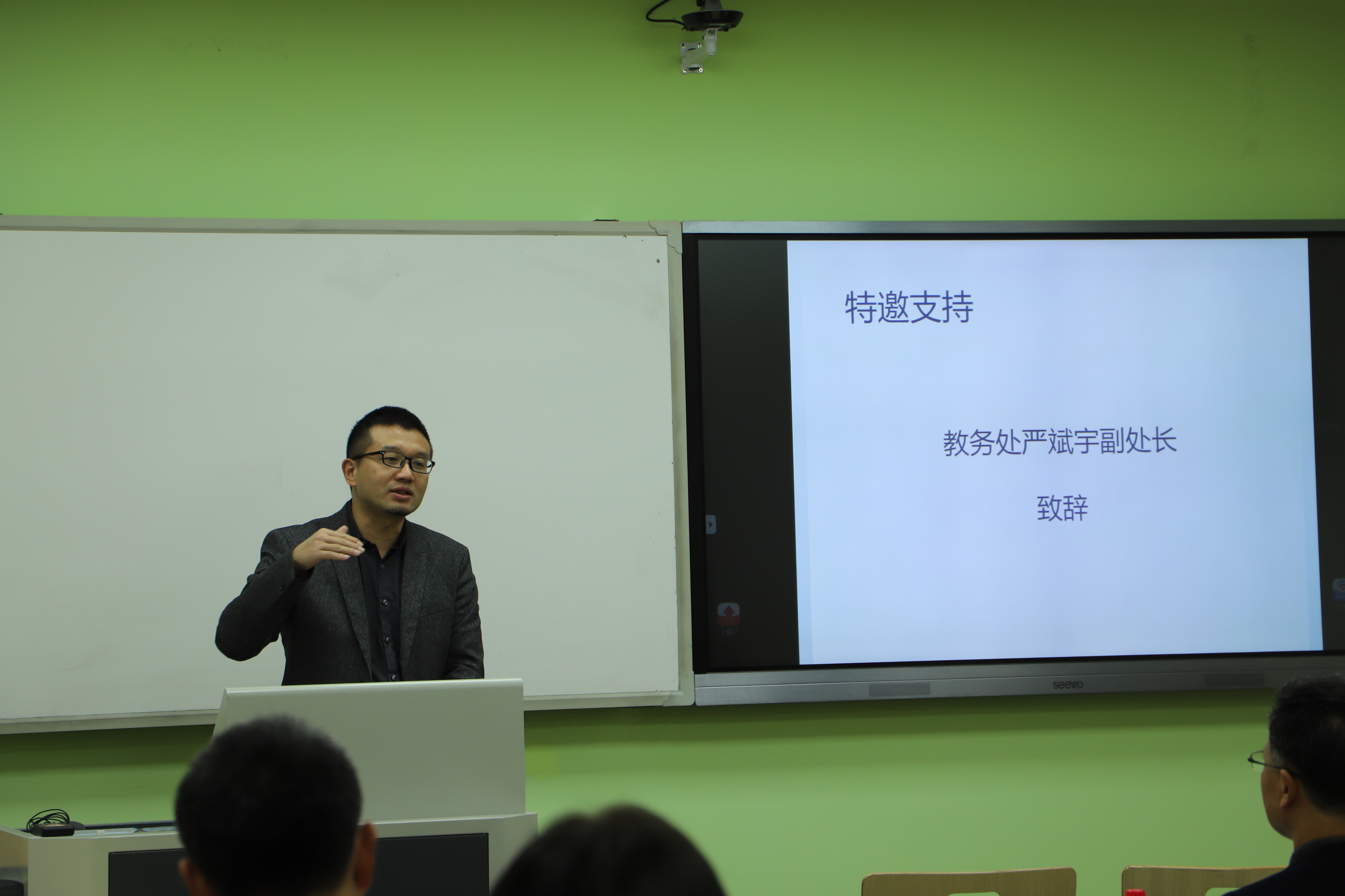 本科教学工作的重视和支持表达了诚挚的感谢。教务处张红伟处长特别委托严斌宇副处长来到比赛现场并讲话。严处长回顾了学校教学竞赛的发展历程,介绍了本次教学竞赛“基于不同类型智慧教室的‘探究式-小班化’教学创新”的主题,并预祝今天的教学竞赛取得成功。