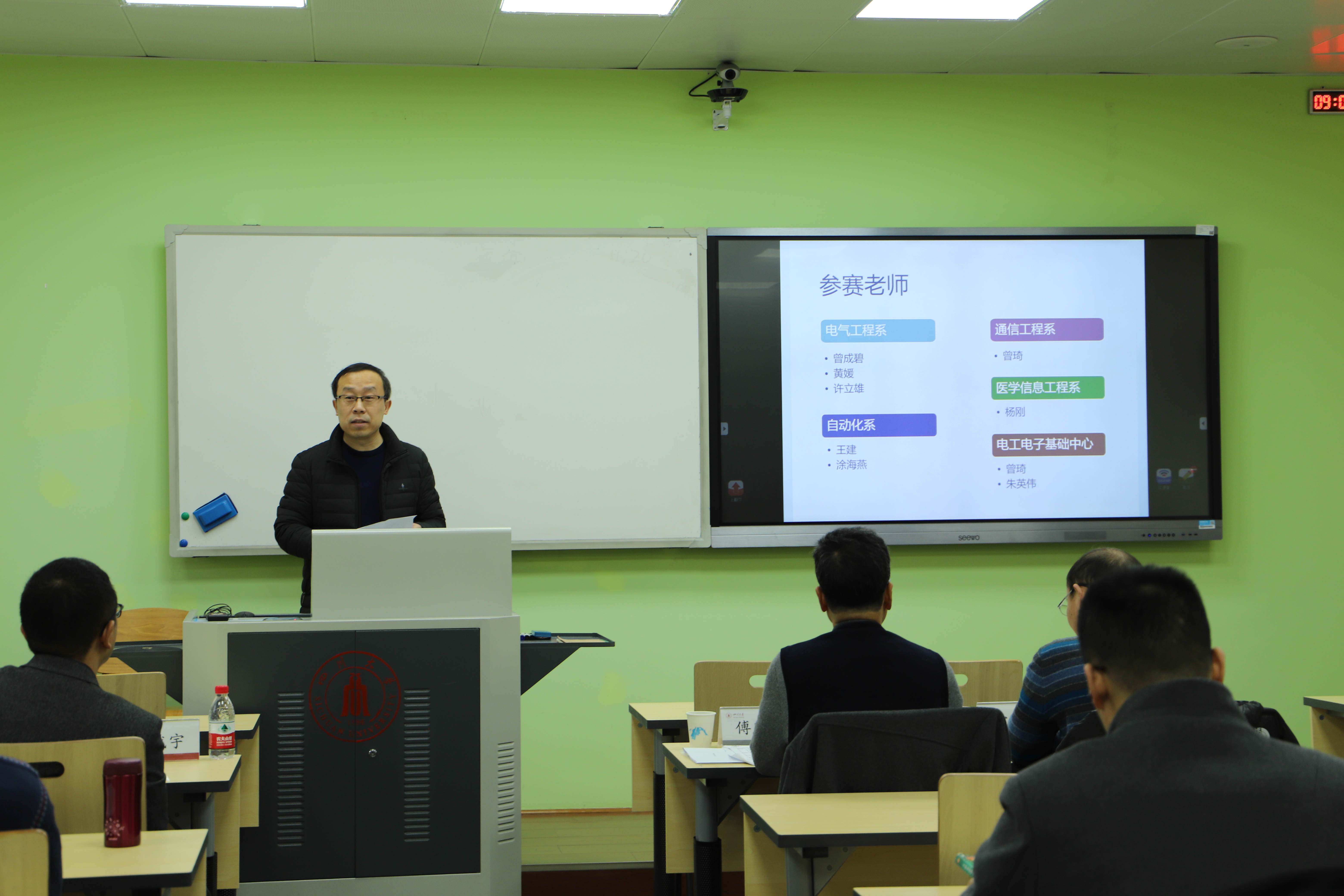 经过各系中心及课程组前期的共同努力,推举出电气工程系曾成碧、黄媛和许立雄、自动化系王建和涂海燕、通信工程系曾琦、医学信息工程系杨刚、电工电子基础教学实验中心曾琦和朱英伟共9位老师参加了于2018年12月21日上午举行的教学竞赛现场授课阶段比赛。比赛邀请了校督导委专家傅师申老师、电气信息学院督导组组长敬东、电气信息学院电工电子基础教学实验中心雷勇(教育部高等学校电工电子类课程教指委委员)和周群(校督导委专家)担任评委。部分参赛课程组教师及青年教师现场观摩了比赛。