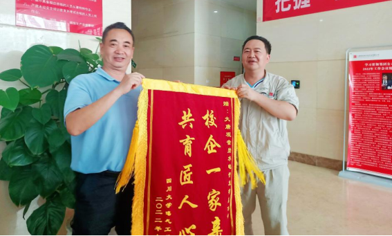 段述江老师代表全体实习人员向水电站信主任送上锦旗,以感谢大唐集团观音岩水电站对MX动漫
