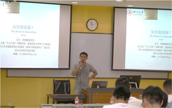 开幕式还特别邀请了特聘副研究员王为博士就“如何做创新”进行了专题讲座。王老师分别从“为什么创新”、“研究生和博士生的任务是什么”、“超导的特性及其应用”,以及“分享自己的科研创新之路”四个方面,为营员们带来了精彩一课。