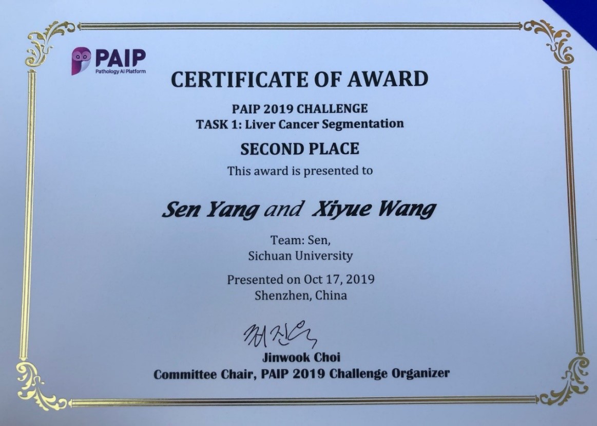 硕士研究生杨森和王熙月组成的团队编写的人工智能算法,荣获 MICCAI PAIP 2019 Challenge:Liver Cancer Segmentation 第二名。