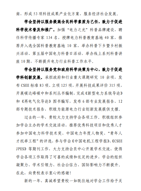 会员中心能一如既往对学会工作给予关心支持。学会将以建设中国特色一流学会为目标,团结带领广大电力科技工作者勇于担当、主动作为,为推动高水平科技自立自强、全面建成社会主义现代化强国作出更大的贡献。