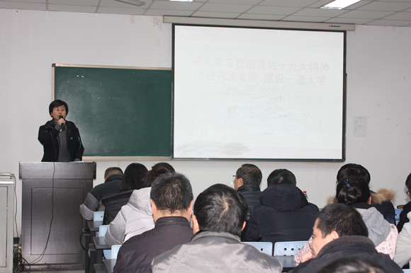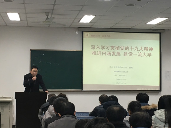 ,为学院全体党员做了题为“深入学习贯彻党的十九大精神 推进内涵发展 建设一流大学”的“学习贯彻党的十九大精神”宣讲会。宣讲会在望江校区启秀楼B座206多媒体教室举行,电气信息学院全体在职教工党员、学生党员代表80余人认真聆听了此次讲座,会议由电气信息学院党委书记韩芳同志主持。