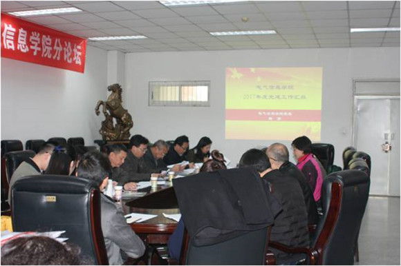 2017年党建工作进行现场考核。会议在基础教学楼A座220学院会议室举行。学院党委书记韩芳同志、党委委员、院长肖先勇教授、党委副书记、纪委书记张英敏同志等院领导、两委委员、教工党支部书记、学生党支部书记代表、教师党员代表、学生党员代表共25人参加了会议。会议由党委书记韩芳主持。