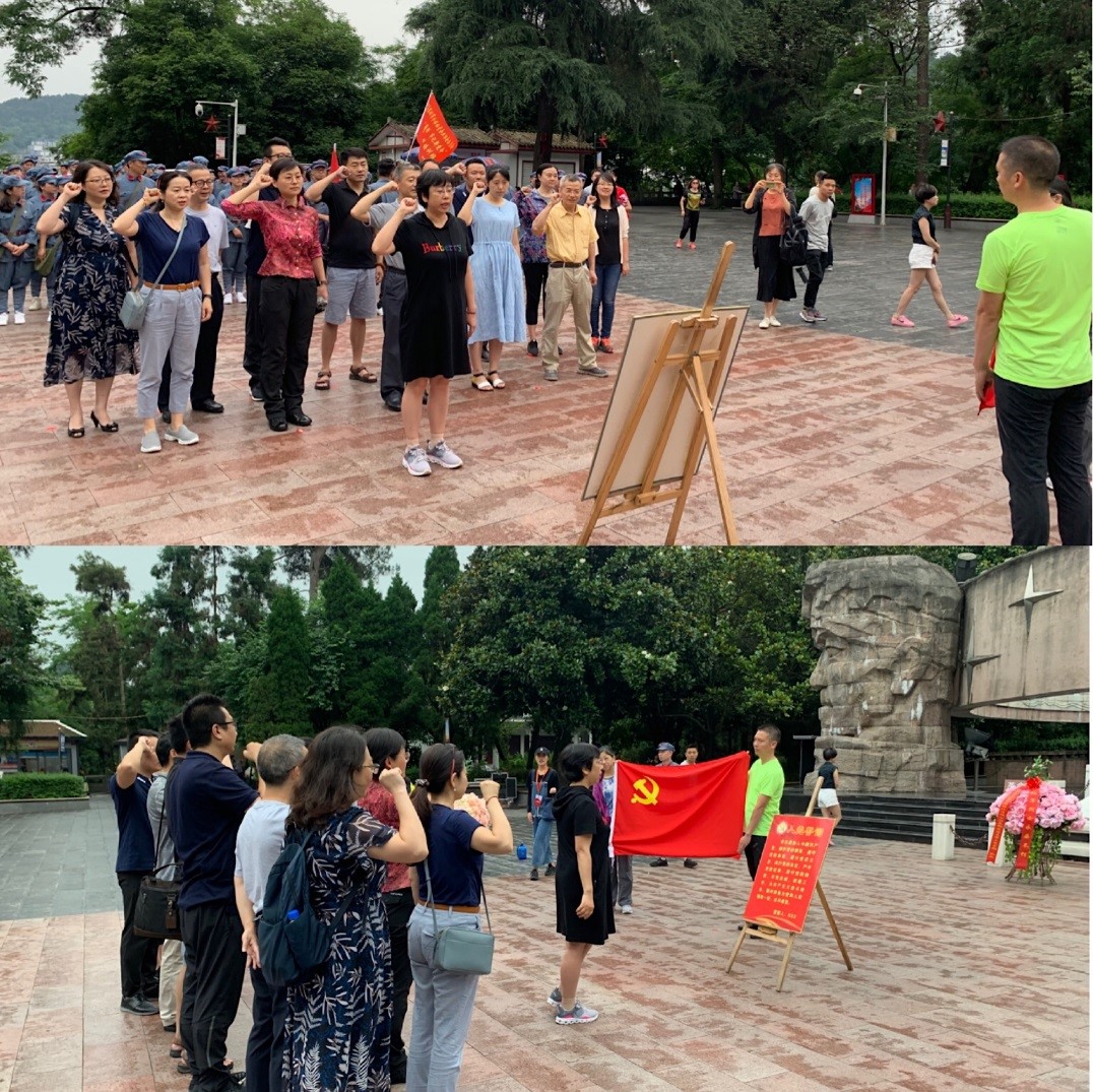 烈士纪念碑下,重温入党誓词,不忘入党初心。6月15日上午,党员教师们来到位于遵义凤凰山周岁麓小龙山的红军烈士陵园内,举行了重温入党誓词的活动。在红军烈士纪念碑下,赵莉华书记带领全体党员面向党旗,集体庄严宣誓,对党忠诚,为共产主义奋斗终生。高亢整齐的声音回荡在纪念广场上,同志们遥望着当年红军鏖战的红花岗,老鸭山,学习先烈们不怕牺牲,敢于拼搏的精神,感悟共产党人的初心和使命。