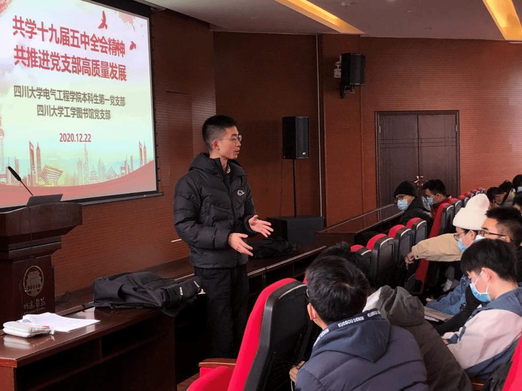 本科生第一党支部书记赵劲帅同志介绍支部情况,他指出,图书馆是同学们学习与开展科学研究的主战场,图书馆资源对川大每位师生都是宝贵且不可或缺的。