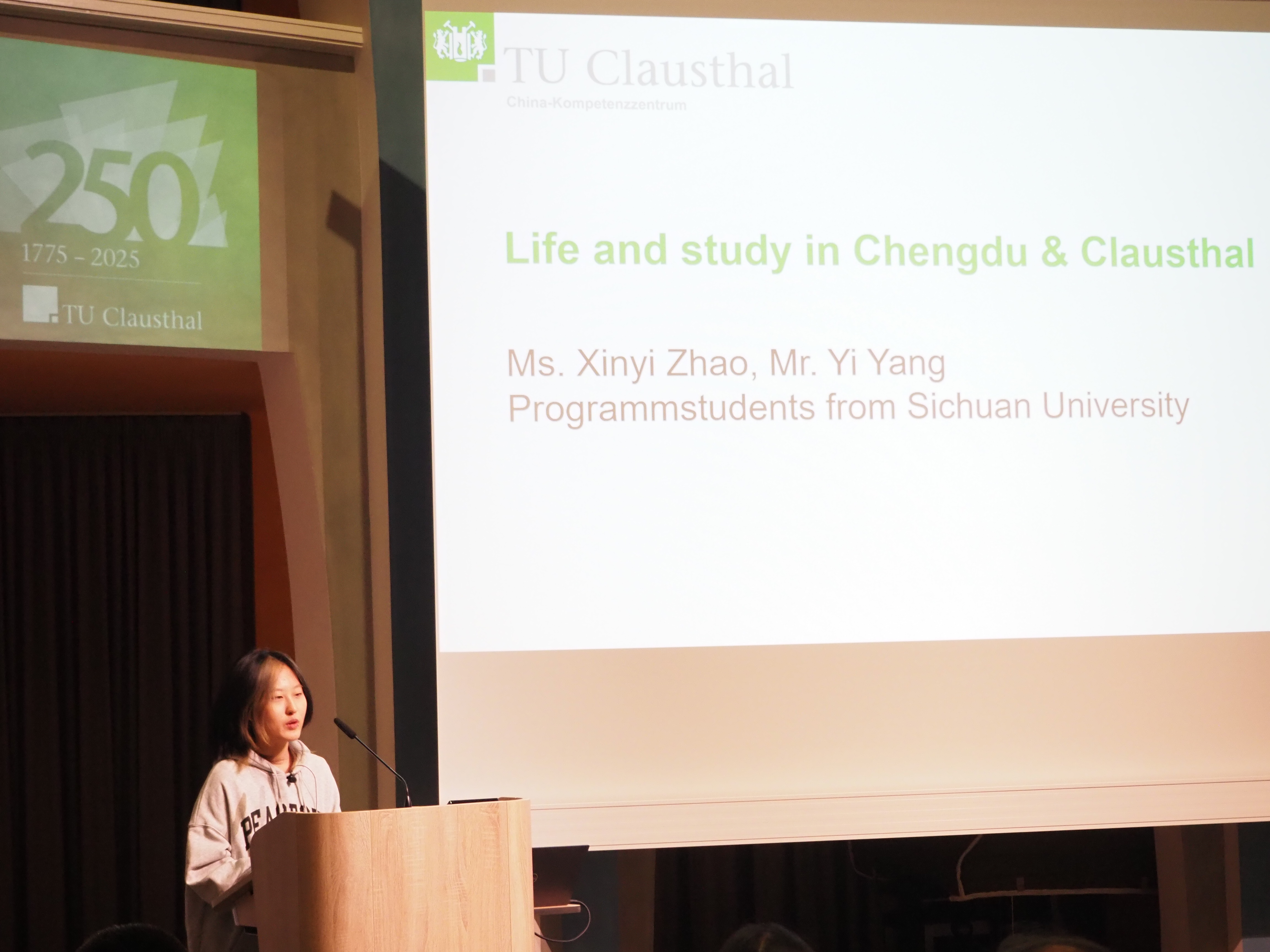 MX动漫 中德班2021级学生赵欣怡和2022级学生杨毅作为学生代表分别以“A Year of Growth and Discovery in Clausthal(在克劳斯塔尔成长与探索的一年)”和“Leben und Studium in Chengdu und Clausthal(在成都和克劳斯塔尔的生活和学习)”为主题作报告,从不同角度分享了他们在中德两校的学习与生活体验。