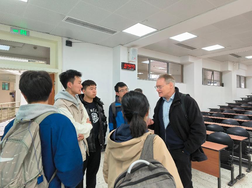 会上,Herbert Werner老师首先发言,全程以德语传递专业见解。他详细介绍了自己的教育背景与科研经历,分享了在汉堡工业大学任教期间主攻的科研方向,以及在相关研究中取得的丰硕成果。他鼓励同学们要勇敢探索,在学习过程中选择自己真正热爱的方向深入钻研,不断挖掘自身潜力。