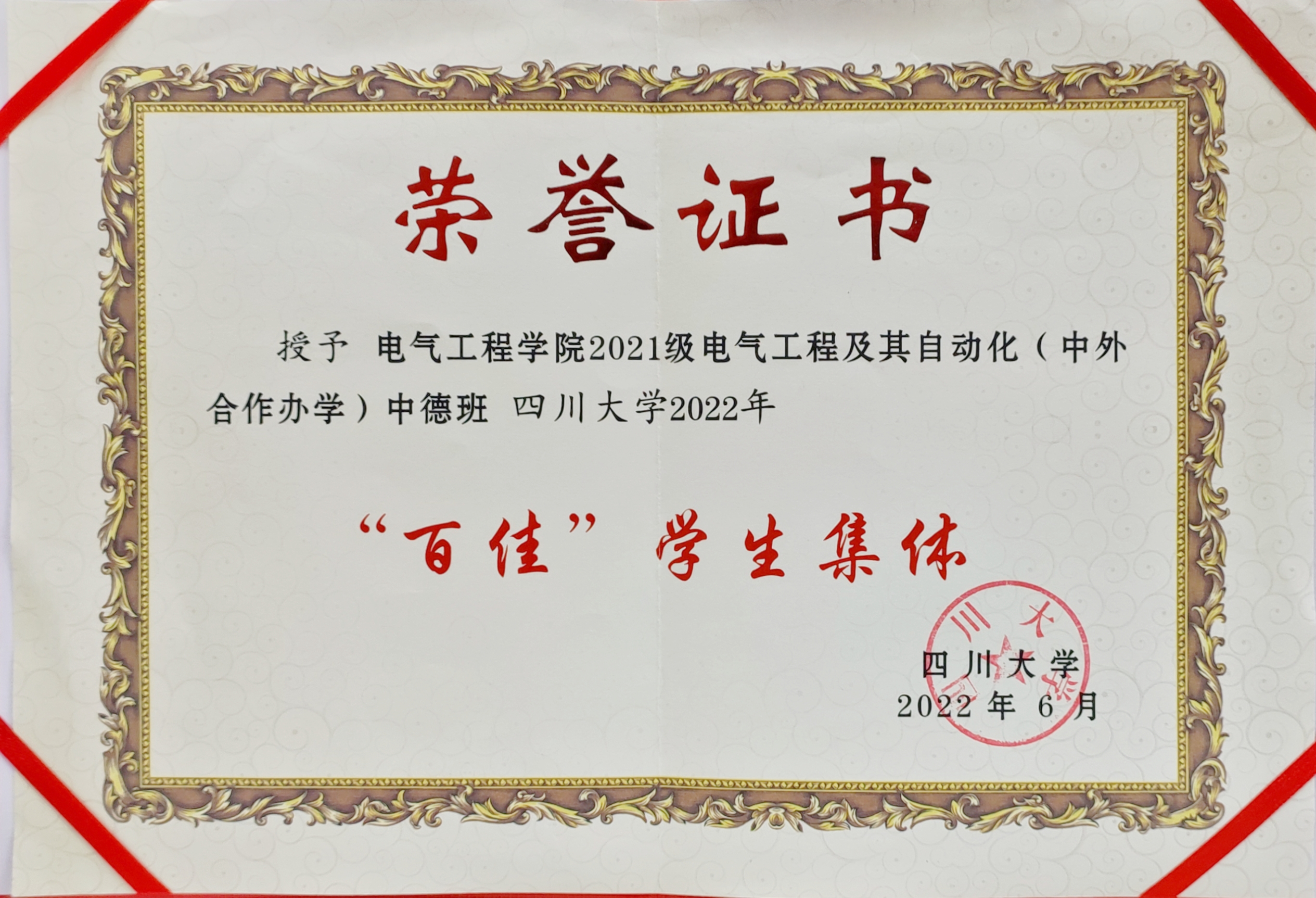 图1 2021级中德班“百佳”学生集体获奖证书