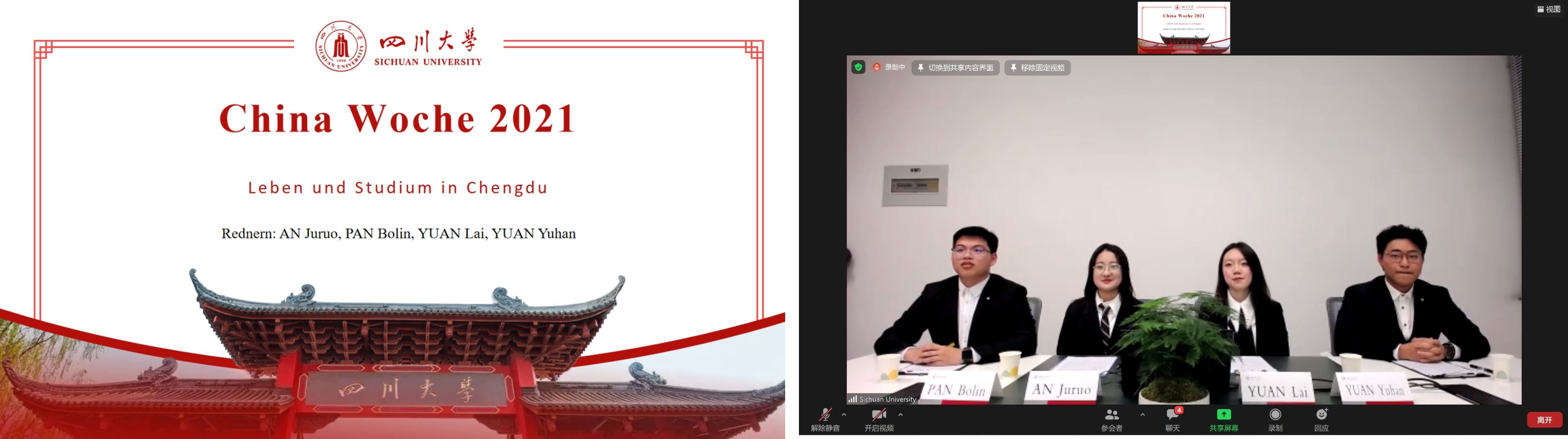 与德国克劳斯塔尔工业大学的国际合作交流平台,积极参加国际交流活动。中德班安举若、潘博林、袁来和袁钰涵四位同学参加了克大第四届“中国周”的“学生主题日”,并作了题为“在成都的生活及学习”的德语线上报告,活动主办方给予了高度评价,报告取得了良好反响。