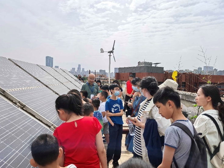 顶楼上阳光明媚,春风和煦。小朋友们到达顶楼参观了真正的光伏板和风机模型,冉立老师介绍了光伏发电与风力发电背后的原理。通过理论与实践相结合,小朋友们对新能源发电有了更深入的理解。