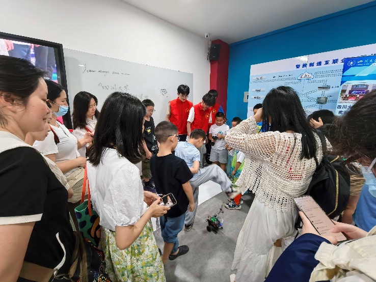 来到三楼罗克韦尔实验室,黄涛老师讲解工业机器臂娴熟的绘画技艺,三支机械臂精确操控画笔在画纸上画出太阳公公的卡通形象,引起小朋友们一片惊叹。智能车协会的成员们向小朋友们简单介绍智能车的相关知识,其自由灵活的运动轨迹吸引了小朋友们的注意力。在志愿者的指导下,小朋友们也亲自动手,操控智能车进行移动。